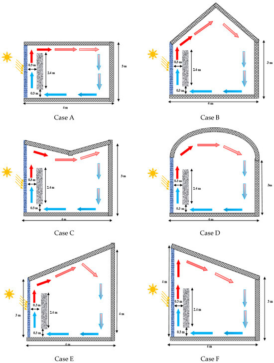 Previous studies [40,41,42] have demonstrated that T-walls with a flat wall and others with rounded corners always improve thermal efficiency and the total efficiency. For this reason, these two different T-wall designs (flat and rounded), and Gable, butterfly, candelabra, and shed roof designs were chosen to be examined in this article due to their important functions. In the study, it is considered that the T-wall was located on the south side of a simple room. The room had height × length × width dimensions of 3 × 4 × 4 m3. Furthermore, the thickness of T-wall and air gap was 0.3 m, and the height of the T-wall was 2.4 m. This solar system received the maximum energy when oriented towards the south and was inclined at an angle almost equal to the latitude of the place (Sousse).