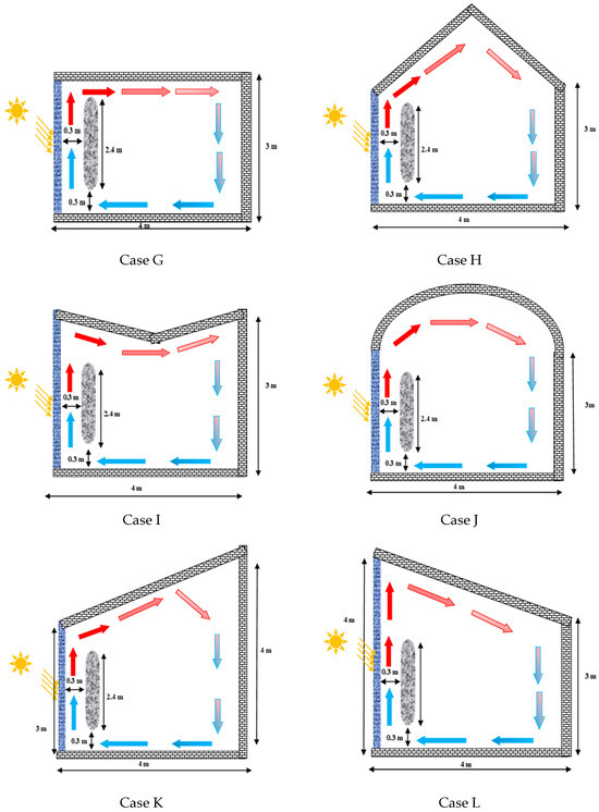 In this study, ANSYS-CFX (15.0) software, a commercial CFD tool, was employed to simulate the thermal and fluid dynamic behavior of the T-wall system. This software utilizes the finite volume discretization approach to solve the governing equations in the computational domain [38,39]. Figure 1 and Figure 2 display the six configurations of roof geometry and the two configurations of T-wall geometry. One of the T-walls was a flat wall, and the other was a wall with rounded corners. Roof geometries were considered to be conventional (A and G), gable (B and H), butterfly (C and I), gambrel (D and J), or shed (E, F, K, and L) roofs.