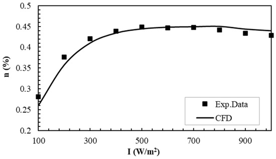The numerical results from CFD were compared with the experimental findings from the study by Duan et al. [18] published in the literature to validate the mathematical model. Under identical circumstances, a traditional T-wall was used in both tests. Figure 6 displays a comparison of the T-walls’ energy efficacy for various insolation intensities. The results were evaluated using the relative error (RE) as follows: