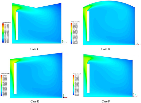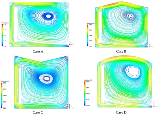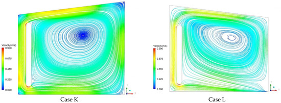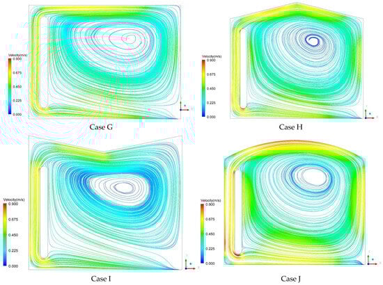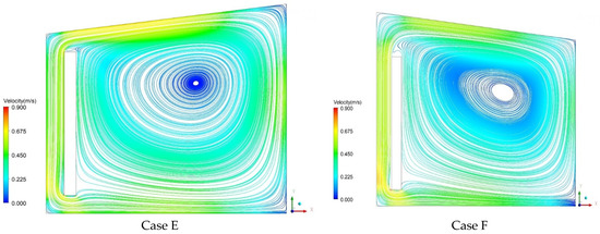 Velocity vector maps clearly demonstrate the locations of recirculation zones as well as high and low velocities. Initially, in every case examined, the solar energy passes through the glass cover and is then absorbed by the T-wall. Hence, some of this energy is transferred to the wall through conduction and the remainder is transferred to the air in the channel by convection. Air is displaced from the bottom of the channel to the top under the influence of the chimney, and this result is in line with previous studies [43]. On the other hand, large recirculation inside the room is observed covering and ventilating the biggest part of the room. It is observed that the air reaching the right wall loses its energy toward the outside of this same wall. As a result, the air is transferred to the lower part of the room and then moves to the bottom of the channel where it was previously further heated by the absorbent wall. This finding is in a good agreement with the flow predicted by Fidaros et al. [24]. A temperature gradient is formed between the locations as a result of this air movement. Furthermore, a tiny vortex is seen to form right at the corner. Near the gap exit, reverse flow patterns are prominent. The airflow is found to have significant turbulence close to the ground and roof. Moreover, flow separation is seen in the channel’s corner between the entrance and the air gap. Then, the air flows to the glass under the influence of inertia. The highest velocity is observed in the middle of the elevation since the flow speed increases as there is heat transfer from the air to the central part of the room, which tends to reduce the differences in velocity and temperature across the duct. The maximum air velocities for roof and T-wall configurations are given in Table 3 according to the results obtained from the velocity contours. It was determined that there was not much of a difference between the maximum air velocities of configurations. Air velocities in Cases D and F were comparatively higher than in Cases A, B, C, and E. Moreover, the region affected by the reverse flow for Cases C and F was relatively smaller than that for the other cases. The maximum velocities generated in the building equipped with a rounded T-wall were higher compared with those of the flat T-wall, as well as in the middle region of the domain where the mean air velocity did not exceed 0.25 m/s for all cases. From these results, it can be seen that, for the various cases considered, the location of the maximum and the minimum values of the magnitude velocity are the same for the different considered cases, and the air velocity of the T-wall increases as the temperature difference between the heat storage wall and the glass wall increases. The wind speed is relatively high when the intensity of solar radiation is strong, such as in summer. On the contrary, the wind speed is relatively slow in winter due to weak sun intensity. Therefore, the T-wall could be used to ventilate buildings with relatively high air flow, and it could be used for building heating in winter through relatively slow airflow heated by sunlight.