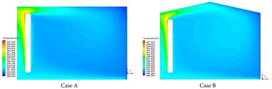 The distributions of the air temperature in the room in the section located at Z = 2 m are shown in Figure 9 and Figure 10 for the different roof and T-wall geometries. Typically, the temperature of the air changed vertically from floor to ceiling, and it was lower on than floor than on the ceiling. The minimum temperature was located at the top right corners of the room for all cases. Furthermore, the high temperatures near the wall were noticeable. The maximum indoor air temperature in the case of a flat T-wall was higher than that in the case of a rounded T-wall (Table 4). Significant changes in temperature across the components of the T-wall were the transmission of solar energy since temperature changes were the fundamental driving force for the T-wall mechanism. These results indicated that the temperature distribution was similar for the different configurations of the airgap considered. For all situations, the determined average temperature for the room’s center was 39.4 °C. Because of the difference in density, cold air spreads out at the ground level. The average indoor air temperature dropped by 6.1 °C as a result of this chilly airflow. Since the air temperature difference between a horizontal plane at Y = 0.2 m and the ground was 7 °C in this instance, a phenomenon of overheating in the room was noticed.