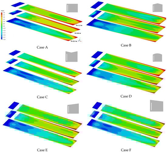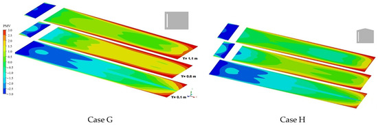 The PMV distribution contours of the six cases (A, B, C, D, E, and F) of the room equipped with a flat T-wall at the height Y = 0.1 m, Y = 0.6 m, and Y = 1.1 m are shown in Figure 11. The figure indicates that the PMV values of the simulation room for all cases were mainly concentrated from −3 to 3. Similar distributions were observed in the study by Irshad et al. [50], where they stated that the PMV was between 0 and 1 and the PPV was around 15% for the building equipped with a T-wall. The authors determined that these thermal comfort index values were within the range of the recommended ASHRAE Standard 55:2017 [45]. Better thermal comfort was obtained at the Y = 1.1 m level compared with the other two levels where the PMV ranged between 0.5 and 1.5. There was a decrease in thermal comfort inside the room at Y = 0.1 m. At this level, the PMV value was between −2 and −1. This was caused by the low temperature occurring due to natural convection in the region close to the ground. The PMV contours demonstrated nearly similar comfort conditions for the six cases at plane Y = 1.1 m. A cool thermal sensation region (PMV = −3 to −0.5) was found at the Y = 0.1 m level. The cold region was more pronounced for Cases C and F.