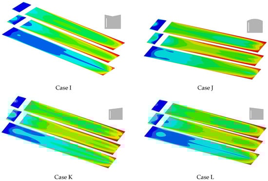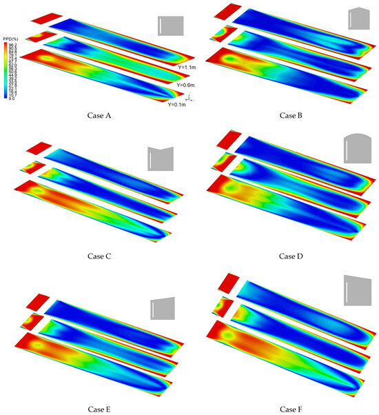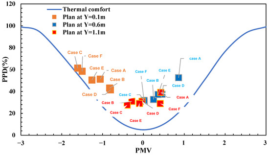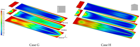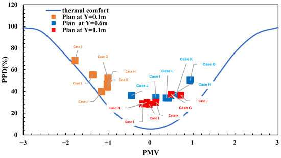 Significant differences in thermal comfort indices were observed for the considered cases at different altitudes (Figure 16). At the Y = 0.1 m level, the PPD values were 52.25, 46.12, 68.41, 39.73, 44.03, and 55.18% for G, H, I, J, K, and L, respectively. A dissimilar trend was observed: 50.31, 33.80, 34.39, 36.29, 36.04, and 33.87% were the average PPD values of the six cases, G, H, I, J, K, and L, for the Y = 0.6 m level, respectively. These values were lower than those among the data at the Y = 0.6 m level. Finally, at the Y = 1.1 m level, the average PPD in case G, H, I, J, K, and L were 37.24, 29.59, 28.51, 36.38, 29.98, and 28.10%. It was determined that Case L was more comfortable than the other conditions at higher levels from the ground.
