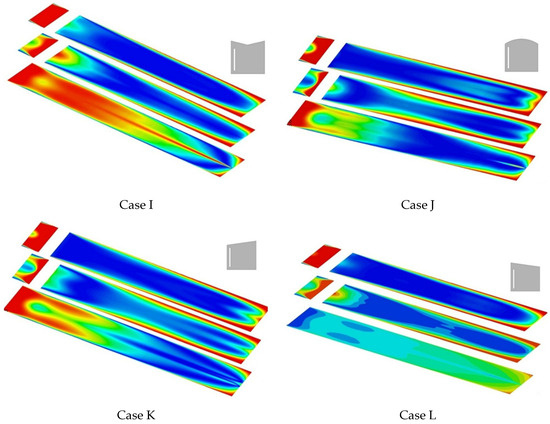Figure 7 and Figure 8 show the distribution of velocity fields at the Z = 2 m location of the room and the T-wall combinations considered. The heated air in the collector moved towards the air gap with the effect of buoyancy. The results confirm that the geometry of the roof and T-wall have a direct significant effect on the velocity fields inside the building.