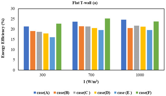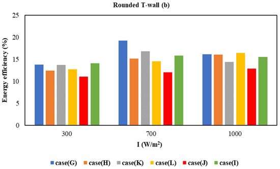 The energy efficiency of the two types of T-wall and roof layouts for various irradiation intensities is shown in Figure 17. All configurations have a gradual rise in energy efficiency when the radiation intensity is increased. Maximum energy efficiency is found to be more than 20% for the flat T-wall and lower than 20% for the rounded T-wall. Among the other combinations, Cases G and F have the highest value, while Cases J and E have the lowest energy efficiencies.