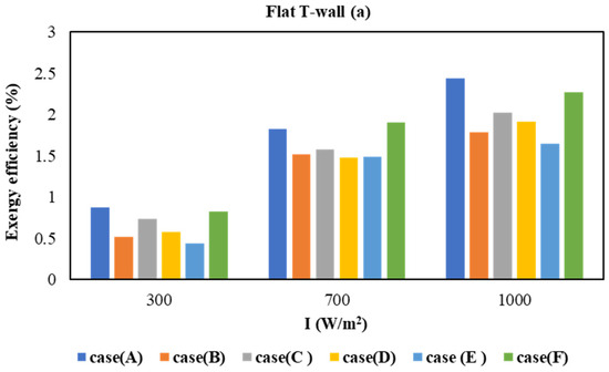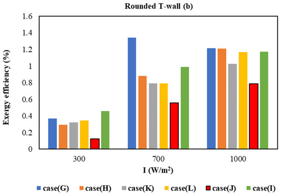 Figure 18 presents the variation in exergy efficiency with the intensity of solar radiation for the two T-walls and roof configurations. It was determined that the increase in the radiation intensity increases the exergy efficiency for all roof configurations. The exergy efficiency ranged between 0.12 W/m2 (Case J) and 2.44 W/m2 (Case A) for the flat T-wall. Additionally, Figure 17a offers the exergy efficiency of flat T-wall for three solar radiation intensity values. The exergy efficiency ranged between 0.43 W/m2 (Case E, I = 300 W/m2) and 2.44 W/m2 (Case A, I = 1000 W/m2) for the flat T-wall. Finally, for the rounded T-wall (Figure 17b), the exergy efficiency changed between 0.12 W/m2 (Case J, I = 300 W/m2) and 1.34 W/m2 (Case G, I = 700 W/m2).