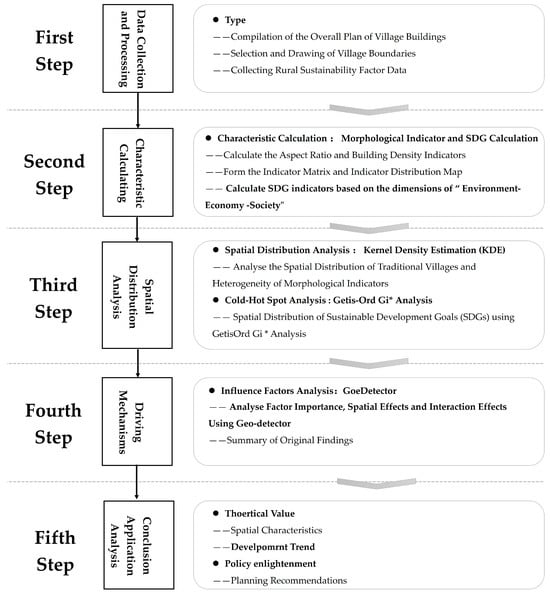 The third step, combined with ArcGIS spatial analysis, was to analyze the spatial distribution and morphological index heterogeneity of the traditional villages. Next, spatial differences in rural sustainability were analyzed from the “environmental–economic–social” perspective, and Getis–Ord Gi* (ArcGIS 10.2) was used to assess the spatial distribution of the 17 SDGs for rural sustainable development.