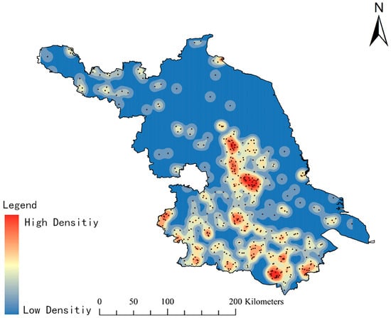 The kernel density estimation (KDE) visually represents the density distribution of a village and is utilized to identify scattered and concentrated areas within the village area. This reveals the changes in the village’s spatial density and can reveal regional differences in the overall pattern of the village’s evolution. Here, we employed KDE to specifically focus on expressing the spatial agglomeration characteristics of traditional villages in Jiangsu, based on which we extracted the spatial agglomeration pattern of rural settlements. The predicted density for a new location (x, y) is determined as follows:
