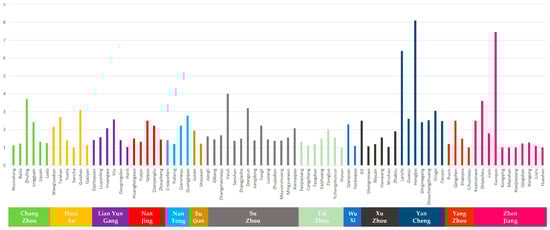 The aspect ratios of traditional villages in Jiangsu Province are generally below 2.0, i.e., finger-like or cluster-like features, accounting for 65% of the total. The traditional villages in Yancheng all have aspect ratios greater than 2.0, and they are all in the coastal reclamation area. Meanwhile, 27.27% of traditional villages in Zhenjiang have aspect ratios greater than 2.0, which are mainly located in polder areas of the Yangtze River (Figure 7, Appendix A—Table A1).