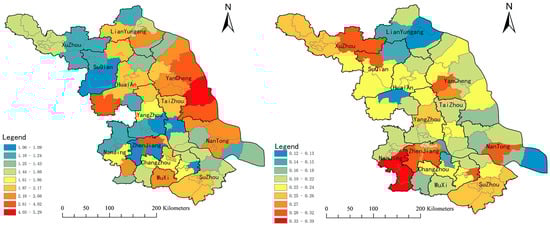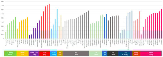 The traditional villages in Jiangsu Province with high building density values are mainly distributed around Taihu Lake, the Ningzhen area, and the Xuzhou Plain area. Among them, the building densities in Nanjing and Wuxi are above 0.25, 87.50% of traditional villages in Suzhou are above 0.20, and 81.82% of traditional villages in Zhenjiang are above 0.20, mainly influenced by the plains and hilly terrain and the developed local economy []. The building density of traditional villages in Jiangsu Province is distributed primarily in the coastal area, mainly influenced by the coastal mountainous terrain and the agricultural and industrial structures of the plains’ reclamation area. Meanwhile, 66.67% of the traditional villages in Lianyungang have a building density of less than 0.15, 42.86% of the traditional villages in Yancheng have a building density of less than 0.15, and 50.00% of the traditional villages in Nantong have a building density of less than 0.20 (Figure 8, Appendix A—Table A1).