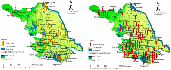 We utilized bar charts to present the spatial morphology indicators of traditional villages in Jiangsu, and to generate a distribution map of the aspect ratio and building density indicators (Figure 9). This allowed us to visually represent the distribution status of the morphological indicators of traditional villages in geospatial space, which can be utilized to summarize the characteristics of the spatial morphology and distribution patterns of traditional villages in Jiangsu.