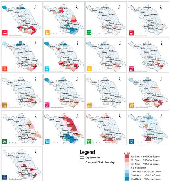 In this study, the Getis–Ord was used to analyze the spatial autocorrelation characteristics of each SDG at the rural scale, as follows: