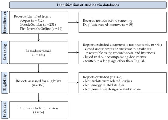 In Google Scholar, a search for “secondary source” or the gray literature was conducted to include limited published documents such as reports, theses, academic conference papers, and others that might not be formally published; the search aimed to ensure comprehensiveness. The search criteria involved the terms “(generative design) AND (design AND building) AND (energy)” within the title–abstract field. We obtained 231 publications from 2021 to 2023.