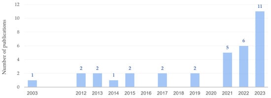 A total of 34 articles were selected spanning 2003–2023 (Table 1). The earliest work identified dates to 2003, but there was a hiatus of 9 years until 2012 before the idea was revisited. From 2012 to 2019, an average of one to two articles were published per year. There were five additional research papers in 2021 and six papers in 2022. There were 11 published articles in the latest year, 2023 (Figure 2). The increase in articles underscores the ongoing interest in this content, notably the recent surge.