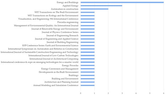 The publications’ sources can serve as a reference point for future studies. The highest number of publications (Figure 3), totaling five articles in this study, were published in the journal Energy and Buildings. The journal is directly relevant to the study of energy use in buildings. Following closely, the journal Applied Energy features three articles related to energy conservation. Number 3, Automation in Construction, contributed two articles relevant to computer-aided design and building. Of the remaining 26 publications, one article was chosen, covering the interdisciplinary fields of engineering, applied science, technology, architectural computing, and the environment. The publications highlight the pivotal role of generative design and energy efficiency in buildings within the research field.