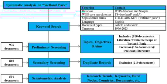 The inclusion and exclusion criteria used to obtain wetland park research are outlined in Figure 1. The criteria included keywords, databases, search terms, language, document types, and timespan [44]. This study only covered Web of Science (WoS) and Scopus, the two most authoritative academic literature sources. Grey literature was excluded because it usually has low scientific quality, and much of the work has been done by non-specialists and inexperienced authors [50]. Because this study examined wetland parks, we employed the TITLE-ABS-KEY (wetland* park*) in Scopus on 2 February 2023 and selected English articles and reviews. Consequently, 597 documents were included. The same topic and criteria were used in the WoS Core Collection to perform a search, namely, TS = (wetland* park*), resulting in 379 documents. For the preliminary screening, we eliminated 166 irrelevant articles whose research content and purpose did not fall within the scope of wetland parks. Then, 490 documents obtained from Scopus and 320 documents from WoS remained. 810 original research documents were obtained and converted from the two databases using CiteSpace V.6.1.R6. For the secondary screening, some of the same articles were indexed from Scopus and WoS, but only one was needed for the analysis. Therefore, we eliminated 219 duplicate records. Finally, 591 documents were included in the study sample.