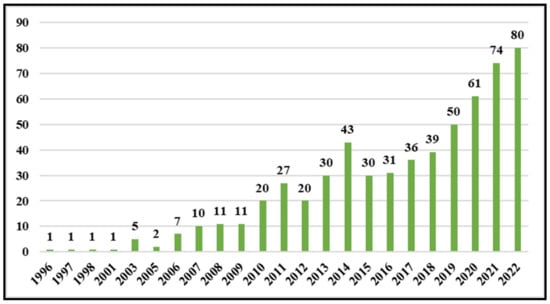 Annual number of articles published from 1996 to 2022 (obtained from WoS and Scopus).