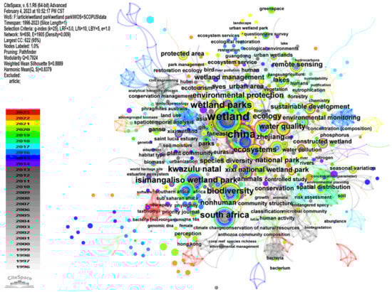 Some countries started constructing wetland parks in 2005. For example, China launched the pilot construction of a national wetland park in 2005 [65]. The country published the Measures for the Administration of National Urban Wetland Parks (for Trial Implementation) on 2 February 2005 and the Guidelines for the Planning and Design of Urban Wetland Parks (for Trial Implementation) on 24 June 2005 [66]. Despite some fluctuations, from 2005 to 2014, the number of annual publications on wetland parks rose. Then, there was a stable increase in annual publications on the topic from 2015 to 2022.