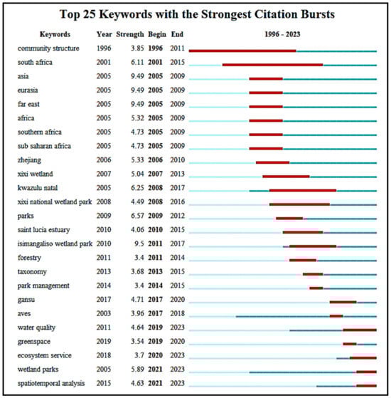 Top 25 Keywords with the strongest citation bursts in studies on wetland parks. Note: ‘Year’ refers to the keyword burst year, while ‘Begin’ and ‘End’ refer to the year a citation burst started or ended. The red line represents the specific diachronic stage when the keyword became a hot topic in academic research; the light blue line shows that the node has not yet appeared, and the dark blue line shows that the node has begun to appear.