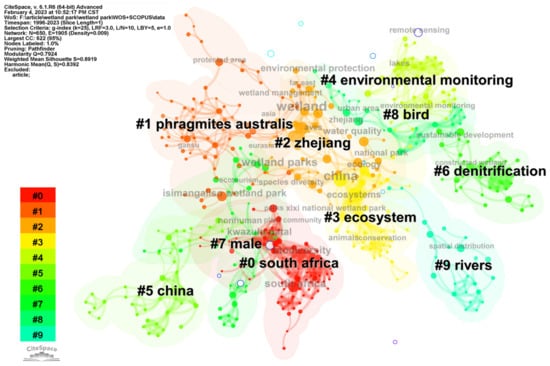 In the analysis, 46 clusters were identified. The top 10 significant clusters are displayed in Figure 5 and Figure 6 based on different classification approaches. The clusters are ordered from #0 to #9, where a low number indicates that many keywords were included in the cluster. The results reveal that Modularity Q = 0.7924 (>0.7) and Mean Silhouette (S) = 0.8919 (>0.7). A Modularity Q result exceeding 0.3 indicates that the cluster structure is significant and clustering homogeneity is relatively strong [58] (refer to Figure 5 and Figure 6, Table 3 and Table 4). The top five cluster labels under each cluster were selected. This study shows that the top 10 clusters are: ‘#0 South Africa’, ‘#1 Phragmites Australis’, ‘#2 Zhejiang’, ‘#3 ecosystem’, ‘#4 environmental monitoring’, ‘#5 China’, ‘#6 denitrification’, ‘#7 male’, ‘#8 bird’, and ‘#9 rivers’ (see Figure 5).