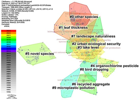 In the abstracts of analyzed studies, the top 10 identified clusters include ‘#0 other species’, ‘#1 leaf thickness’, ‘#2 urban ecological security’, ‘#3 lake level’, ‘#4 organochlorine pesticide’, ‘#5 novel species’, ‘#6 recycled aggregate’, ‘#7 landscape naturalness’, ‘#8 bird dropping’, and ‘#9 microplastic pollution’ (see Figure 6 and Table 4). Further, the clusters ‘#0 other species’, ‘#1 leaf thickness’, ‘#5 novel species’, and ‘#8 bird dropping’ indicate that numerous studies focused on biodiversity, particularly in plants and animals. The clusters ‘#2 urban ecological security’ and ‘#3 lake level’ indicate that studies also focused on ecological safety and water levels. The clusters ‘#4 organochlorine pesticide’ and ‘#9 microplastic pollution’ indicate that pollution in wetland parks’ was a popular topic. The clusters ‘#6 recycled aggregate’ and ‘#7 landscape naturalness’ indicate that a number of studies focused on nature-based solutions in the construction of wetland parks. Thus, the primary research directions were biodiversity, ecological safety, water level, nature-based solutions, and pollution problems. The results were consistent with the cluster analysis results outlined above.
