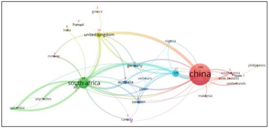 In VOSViewer, the unit of analysis was set as countries, while the type of analysis was bibliographic. The minimum number of documents for a country was two, and the minimum number of citations for a country was zero. Out of 47 countries, 29 met the thresholds. Furthermore, for each of the 29 countries, the total strength of the citation links with other countries was calculated. Subsequently, countries with the greatest total link strength were selected. As shown in Figure 7, China (n = 340) and South Africa (n = 95) produced the highest volume of wetland park research among countries, and both are developing countries. Apart from China and South Africa, the third most productive developing country was India, which ranked 10. Most of the top 15 most highly productive countries in terms of wetland park research were developed countries: the United States, the United Kingdom, Australia, Italy, Sweden, Germany, Canada, Norway, Portugal, South Korea, Greece, and Spain.