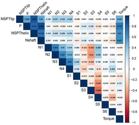 The first concern was cleaning data to eliminate errors like missing values and inconsistencies, a procedure that reduced the original dataset to 7632 samples. Next, variables were chosen as inputs for predicting the installation torque. P refers to the pile tip depth corresponding to a given measured torque, as presented in Figure 3, and represents the SPT index at the pile tip level. The so-called Initial Dataset comprised only these two inputs plus the measured torque. Figure 3 presents other proposed inputs: –, representing the initial four m-depth SPT index after eliminating the first meter. It is well known in Brazilian practice that the pile penetration causes a gap in the pile shaft surrounding soil to at least 1 m depth. Therefore, the soil contribution on torque at 1 m depth is disregarded.