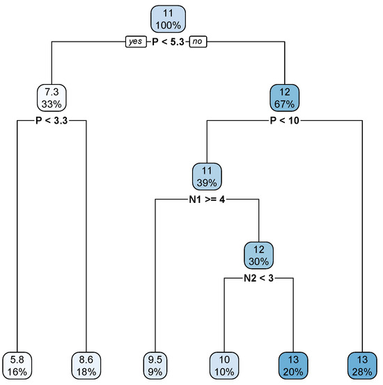 A DT is a unidirectional graph that starts at a root node, proceeds to decision nodes, which divide the dataset using predefined rules, and ends at leaf nodes, where a value is assigned to the output [23]. When used for regressions, the model uses error parameters during training to define the tree architecture and calibrate the rules for decision nodes. Figure 5 presents a DT example that uses inputs P, , and . Each node presents a predicted torque and a percentage of data representing it. Note that the sum for all nodes of any layer is 100%. Most DTs are binary, meaning that each decision node distributes examples exactly to two nodes. The rule used in each node should be calibrated to maximize the precision of the DT, considering first the leaf node and then the previous ones recursively.