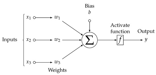 The human neurological system inspires ANN. The basic process of an artificial neuron is shown in Figure 6. The neuron receives inputs, or signals, weighted by . These contributions sum is the input of an activation function that gives the neuron output y, which can be an input to another neuron. Connections between neurons and their weights determine the architecture of the ANN. One can demonstrate that one neuron can replicate any linear function.