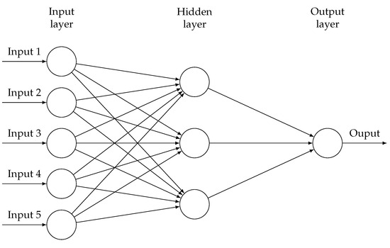 The training of an ANN model is based on the adaptation of the architecture to minimize predictive error. Neurons are usually organized into layers, including an input layer, one or more hidden layers, and an output layer. Figure 7 illustrates a neural network. The universal approximation theorem states that an ANN with one hidden layer containing a finite number of neurons can approximate any continuous function. Thus, one can demonstrate that an ANN with two or more hidden layers containing finite numbers of neurons can approximate any function.