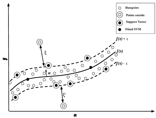 The SVM basic idea is constructing hyperplanes separating positive and negative data, ensuring global minimums, and maximizing the model generalization [27]. In regression problems, boundary lines create a margin around the hyperplane to contain all points of the training dataset, and support vectors are the data points placed at the boundary lines. Considering a margin , the hyperplane and boundary lines can be formulated as