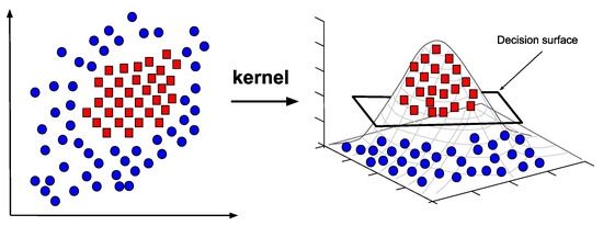 The solution of the optimum hyperplane that minimizes is unique. It is possible to smooth the margins, allowing some training points to be outside the margin limits, which contributes to avoiding overfitting. It is also possible to embrace non-linear problems, such as the one presented in Figure 8, using kernels: functions that map the input space into a higher dimension space. The objective is to obtain a problem in this higher dimension that can be evaluated using a linear SVM. Figure 9 presents an example of kernel mapping data from a 2D space to a 3D space.