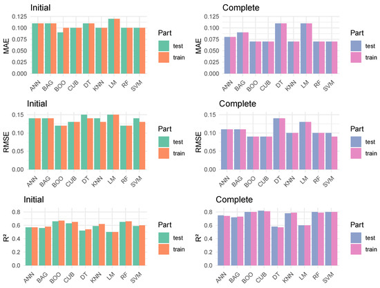 The right part of Figure 10 presents the performance of the models in the training and testing stages regarding the Complete Dataset. Model performance was again similar when results of both training and testing stages were evaluated, evidencing no overfitting. The poorest performance occurred for LM and DT models, exhibiting very close values for the evaluation parameters. The other tree-based models (RF and CUB) performed well again, which emphasizes that the poor performance of the DT model was due to its simple form. The CUB model showed the best performance in both stages, followed by SVM in the training stage and BOO in the test stage. More importantly, comparing metrics from the Initial and Complete Datasets reveals that all models improved performance when the Complete Dataset was used.