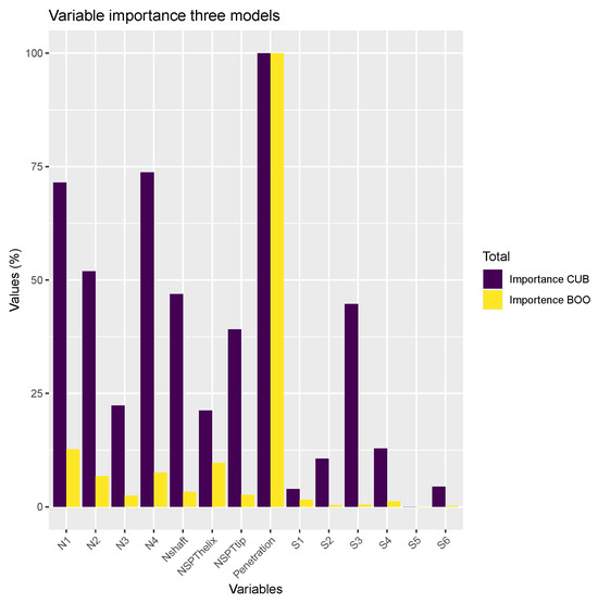 The pile depth (P) was used in all predictions for the three models and is the most crucial variable. The prevalence of the importance of P is more apparent for BOO, considering that the second most important variable for this model () was used in approximately 13% of all predictions. On the other hand, the CUB model showed the most balanced usage of variables, with seven variables being used in more than 40% of all projections.