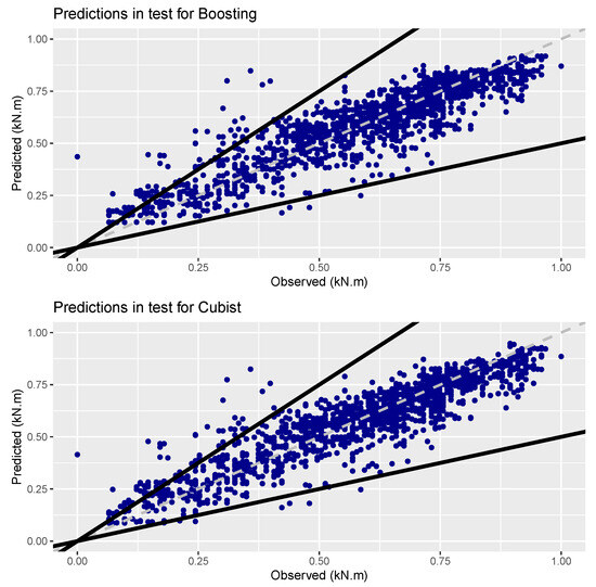 Figure 12 shows torque-measured values compared with the predictions made with BOO and CUB models for the test stage using the Contribution Dataset. In this figure, the grey dashed line represents predictions equal to measured values, and the black lines represent limiting prediction values equal to measured values ±50%. A reasonable accuracy is observed for the predictions with the two models. Less deviation is observed for torque values greater than ∼eight kNm, generally not associated with shallow depths.
