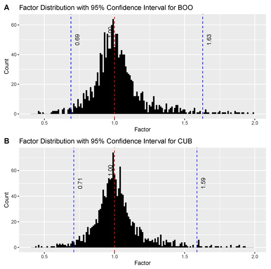 This factor was calculated for all 7632 predictions obtained using BOO and CUB models, with the results sorted in ascending order to construct a histogram for each model. Figure 13 presents the histograms showing the frequency distribution of these data in intervals of 0.01. The dashed line at the factor equal to 1 is the median, meaning that the predicted value equals the observed one. The left and right-handed dashed lines represent, respectively, the 2.5% and 97.5% percentiles; therefore, the range between these lines contains 95% of all factors, corresponding to a 95% confidence interval.