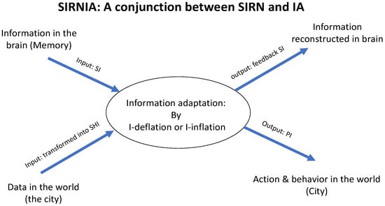 From Figure 1, it can be seen that the process of information adaptation forms the core of the SIRNIA model. Its essence is an interaction between the two flows of information to which the urban agent is subject: It first transforms the data conveyed by the environment (e.g., city) into quantitative Shannon information (SHI), which in its turn triggers an information flow from the mind/brain that adapts the local information flow from the environment to the global information flow previously constructed (“stored”) in the mind/brain. In this process, if the data from the environment is insufficient, the mind/brain adds data, resulting in information inflation (I-inflation); when it is superfluous, it extracts data, resulting in information deflation (I-deflation). The outcome is the meaningful entity/image that we see (SI) and the entailed behavior and action (PI).