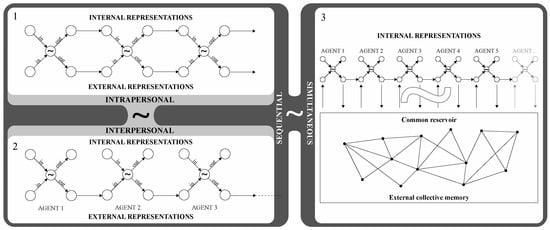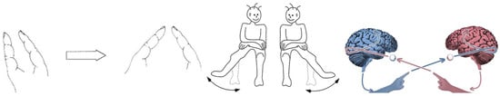 Schmidt et al. [23] conducted a similar experiment but with two people instead of one (Figure 2, center). The two people were asked to move their lower legs in an anti-parallel fashion and to watch each other closely while doing so. Once again, as the speed of the metronome and the leg movement increased beyond a certain speed, an involuntary transition to the in-phase motion suddenly occurred, identical to the HKB [22] phase transition in the single person’s experimental model ([24], pp. 87–90). The important property of this experiment is that, in this case, we are dealing with a collective behavior—a process that is central to social and urban dynamics and to cities as HCSs. Figure 2, right, is another experiment that exhibits the same results, this time in the context of an explicit study on coordination dynamics as a foundation for understanding social behavior [25].