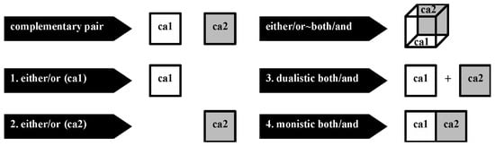 According to this view, the apparently/seemingly polarized entities of a given complementary pair (such as, e.g., body~mind, town~country) are interpreted as complementary aspects (ca1 and ca2 in Figure 4). The general idea is that contraries are complementary, not contradictory, with the implication that “not only the polar complementary aspects of complementary pairs that matter, but also all the stuff and all the action falling in between them” [31].
