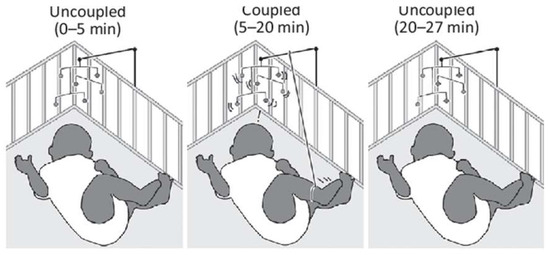 A second application commences with Kelso’s study on the emergence of agency [33]. At the core of Kelso’s paper is a seminal experiment conducted by the late Carolyn Rovee-Collier (1942–2014) and her associates regarding the phenomenon called mobile conjugate reinforcement (MCR), as illustrated in Figure 6. A typical MCR experiment starts with a ribbon attached from a 3-month-old infant’s foot to a mobile suspended overhead. As illustrated in Figure 6 left, at the beginning, the mobile is still while the baby exhibits spontaneous kicking—the baby and mobile are uncoupled. After some time (t = 5, Figure 6 middle), as the baby realizes that by kicking it can make the mobile move, the baby and the mobile are coupled and the baby’s kick rate and the amplitude of the mobile movement rapidly increase up to a steady state. Moreover, the phase relation between the baby’s leg movement and the motion of the mobile increases, characteristic of a resonant coupled state. At t = 20, the baby and the mobile are again uncoupled; the kick rate decays back to a baseline level. Based on a theoretical/mathematical study by Kelso and Fuchs [33] that uses the concepts, methods, and tools of coordination dynamics, Kelso [33] concluded: