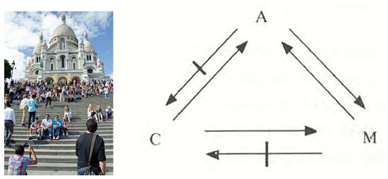 (Left): A pattern of space (e.g., the steps to the Sacré-Coeur in Paris) affords/conveys also the pattern of event = the PI action of seating. (Right): According to space syntax, the relations between the city’s global morphological configuration (C), the city points of attractive land uses (A), and movement (M) are asymmetric: C determines both A and M but not vice versa; on the other hand, A and M might influence each other ([52], Figure 3).
