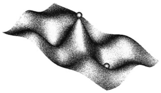 A common way to describe and analyze the dynamics of a system is by means of the so-called potential landscape. For example, in his synergetic approach to Brain Dynamics, Haken [54] describes the dynamics by means of the potential landscape (V) in a space of two order parameters symbolized by the two balls in Figure 8. Given an order parameter (OP), V specifies its potential landscape, that is, spectrum of possibilities and potentialities as attractors (Figure 8). This allows quantification of both OP and V. Thus, the ball on the top of the hill is in a multistable state as depending on initial conditions (in fact, every small fluctuation of the landscape), and it can be attracted to one of the valleys below, while the ball at the bottom of the valley is at a stable state as small fluctuations will not affect its position.