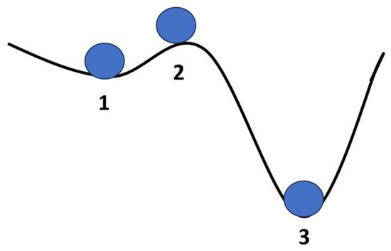 Metastability can also be described by a potential landscape, as in Figure 10. In this figure, ball 1 illustrates a metastable state, ball 2, a transitional ‘saddle’ configuration, while ball 3 represents a stable state.