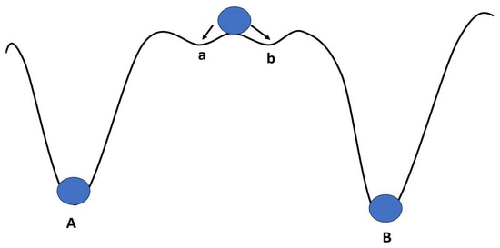 As discussed above, in developing the notion of a ‘complementary pair’ (CP), Engstrøm and Kelso [26] suggest that the ubiquitous human tendency to dichotomize and perceive things, events, or processes as contraries overlooks the coordinative regime of metastability in which the above seeming negations are in fact complementary. Figure 11 is a suggestion to build a potential landscape that describes both the ubiquitous human tendency to dichotomize and the coordinative regime of metastability. Here, following Kelso’s ‘complementary pair’, metastability refers to a system that exists beyond stability, as if in between (i.e., beyond) two stable states that negate each other, symbolized by balls A and B in Figure 11. According to this conceptualization, the metastable regime can be seen as a ball moving between the two hollows a and b on the left and right of the ball, which symbolize the two aspects of the complementary pair A~B. As long as the ball moves back and forth between the two a and b hollows, the system is metastable and forms a complementary pair. However, once it moves beyond the saddles on the left and right of a and b, the system collapses from the complementary pair A~B to a negation, that is, to a bistable regime with either A or B. Metastability is thus a delicate regime that is constantly being threatened by the two extreme states A vs. B. For example, in the above case of the crisis of democracy studied by Kelso [36], after half a century of metastable regime between the two tendencies of democracy (liberalism and the rule of the demos), the democratic system collapsed into a bistable regime.