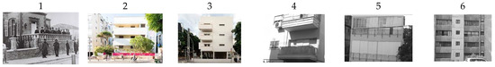 From left to right: 1—Tel Aviv 1911. 2—A typical Bauhaus building. 3—An intruded pillared floor. 4—A typical open balcony in the 1950s. 5—A closed balcony. 6—No balconies.
