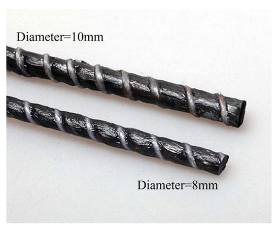 BFRP is a new composite material formed from the melting of multi-stranded basalt fiber and matrix material. The fundamental mechanical properties of BFRP vary depending on the combination ratio of the fiber and matrix materials. The BFRP used in the study is shown in Figure 1. It was 8 mm in diameter and 10 mm in diameter, and the mean density of the bar was 2.089 g/cm3. In order to provide better bonding performance and anchoring force, the surface of basalt fiber reinforcement was quartz sand (the material composition is SiO2), resulting in a rougher surface and larger surface area. The physical and mechanical properties of tendons were tested in the laboratory.