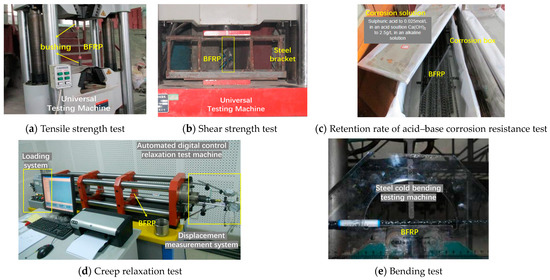 The following are of importance: ① Refer to The Standard of Basalt fiber and its products for highway engineering [39], tensile strength testing is carried out by a universal hydraulic tester with digital control, and the length of the tensile is collected by a digital elongation meter with a high sensitivity (as seen Figure 2a). ② Refer to The Standard of Basalt fiber and its products for highway engineering [39]. Universal testers are used to test the shear strength (as seen in Figure 2b). ③ Refer to The Standard of Basalt fiber composites for civil engineering structures [40]; bars were placed in an acid–base solution for 30 days to test the retention rate of acid–base corrosion resistance. And sulphuric acid to 0.025 mol/L in an acid solution and Ca(OH)2 to 2.5 g/L in an alkaline solution. The sample is then rinsed with water and air-dry after soaking to test the tensile strength (as seen in Figure 2c). ④ The creep relaxation test was based on The Standard of Metallic materials—Stress–relaxation test [41]. The relaxation performance of the pre-stressed metal was tested using a fully automated digital control relaxation test machine. The initial strain of the control sample was 0.6 fu (fu is the average tensile strength of the same batch of specimens, Figure 2d). ⑤ Refer to The Standard of Metallic Materials—Bend Test [42], in which a cold-bending steel testing machine is used to load and flex the tendons in a continuous manner at a loading rate of 2 mm/min with 3d as the diameter of the bars (Figure 2e). The results of the experiment are shown in Table 1.
