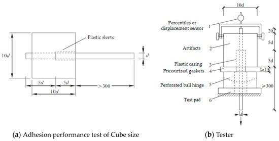 The experimental study described in this paper was conducted with reference to the Chinese Standard GB50010 [43] for a method of comparative testing of the bond strength of steel and reinforced concrete. A coarse aggregate with a diameter of 5 to 10 mm was chosen to fabricate samples based on the test. Three samples per group were imaged in the M20 mortar, M30 mortar, and C30 concrete. The type and ratio of cement base can be seen in Table 2.