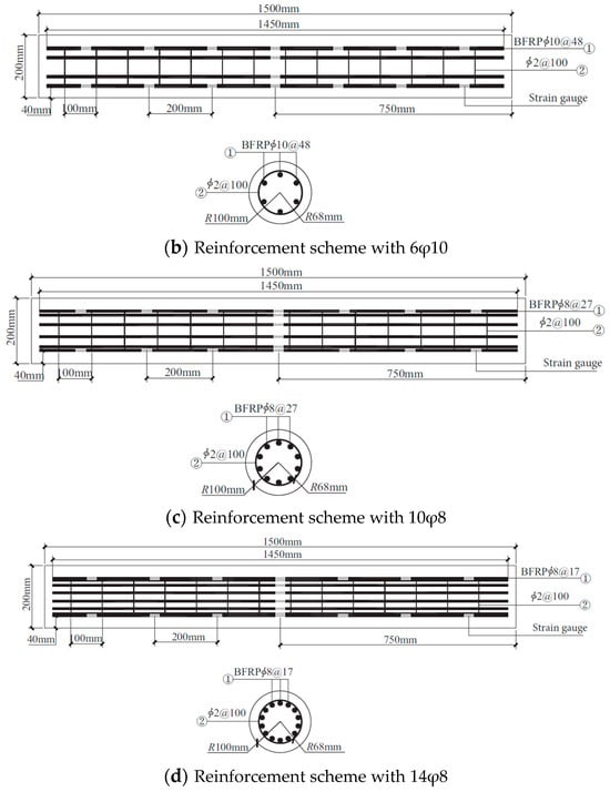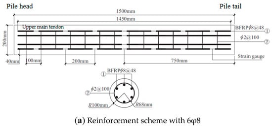 RC piles with BFRP bars are 1.5 m in length and 0.2 m in diameter; the strength rating of the pile concrete is C30. Four types of reinforcers were designed for this experiment. The concrete reinforcement scheme is shown in Table 3. The main bar of the test pile is BFRP, and the hoop is round wire with a diameter of 2 mm. BFRP is the main tendon of the test stack and a 2 mm diameter round hoop tendon. Referring to Technical codes JGJ94 [44], GB50330 [45], and GB50010 [43], the steel stirrup spacing is 100 mm, and the concrete cover thickness is 40 mm. Figure 5 is a schematic diagram of a rigid pile.