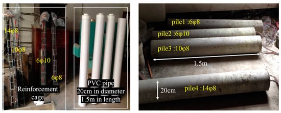 Test pile mold adopts PVC pipe 20 cm in diameter. Before pouring, the steel cage should be placed in the PVC pipe, and the position of the steel main bar should be marked on the outside of the cage if the center of the cage overlaps the center of the PVC pipe. The concrete is poured in a two-step process. Once the concrete is poured into one half of the pile, vibrating rods are used to mash the concrete and then poured into the top half. After pouring, cover the top plug and direct the strain gauge line from the opening position of the plug for protection. Figure 6 shows the piles.